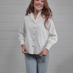 Simple, stylish, and versatile, it's perfect for dressing up or down all season long. Add a touch of holiday elegance with this white long sleeve top, featuring classic ruby red buttons for a festive pop of color.