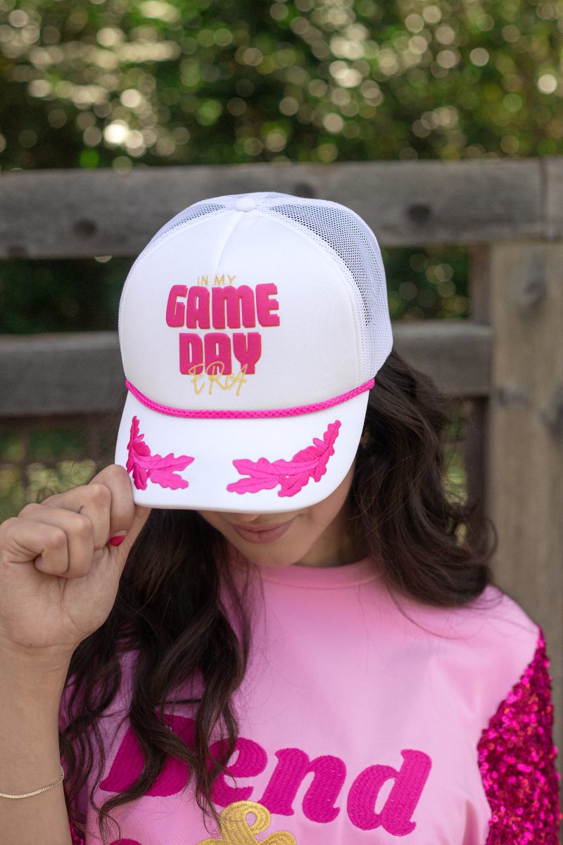 We're in our Game Day era! The Game Day Era Cap is a trucker style snap back cap with puff wording and pink "scrambled eggs" embroidered on the bill.