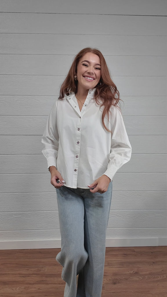 Simple, stylish, and versatile, it's perfect for dressing up or down all season long. Add a touch of holiday elegance with this white long sleeve top, featuring classic ruby red buttons for a festive pop of color.