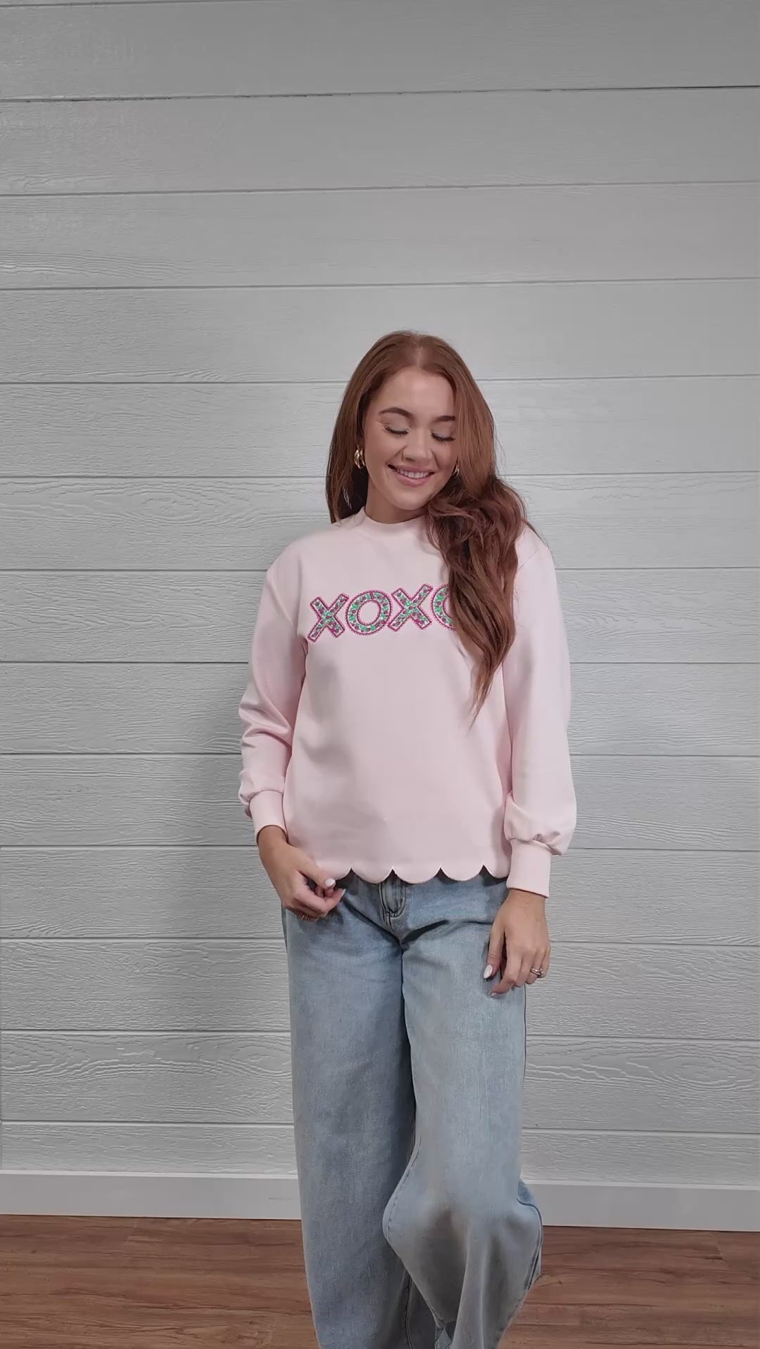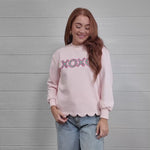 Woman wearing a pink sweatshirt with 'XOXO' embroidered design with scalloped hemline against a white background.