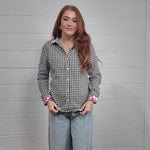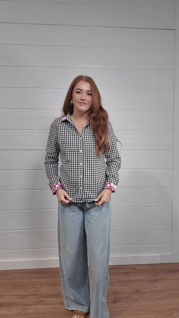 Perfect for layering or wearing on its own, it transitions seamlessly from season to season. This black and white gingham top is a timeless staple with a flattering fit and effortless charm. Embroidery featured on the collar & on both sides of wrist for versatile ware.