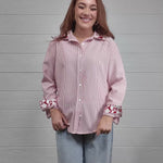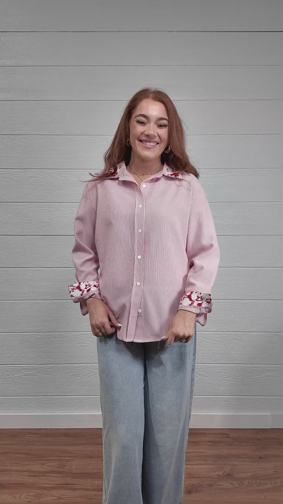 With its classic fit and long sleeves, it's a polished piece you'll love for Valentine's Day and everyday wear. This red striped button-up features delicate red and white embroidery on the collar and cuffs, adding just the right amount of charm.