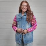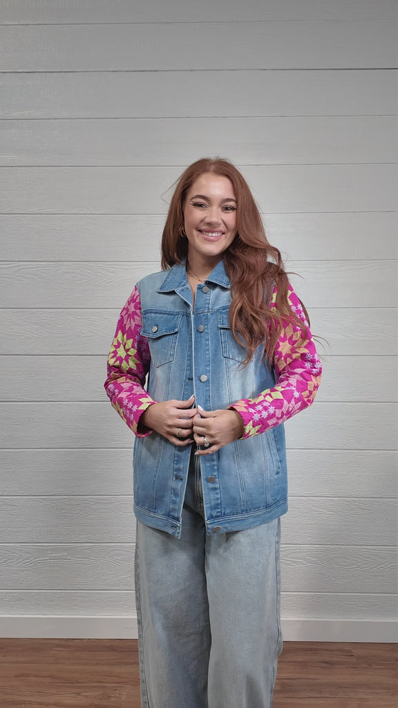 This denim jacket is giving rodeo royalty with its statement patchwork sleeves that add the perfect pop of western charm. Classic denim meets playful cowgirl flair for a look that stands out without trying too hard. Throw it over a graphic tee and boots for daytime, or layer it with a cozy sweater and statement belt for chilly rodeo nights!