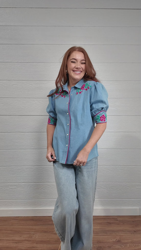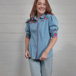 Women wearing a denim pearl snap top with pink western floral embroidery and green leaves.