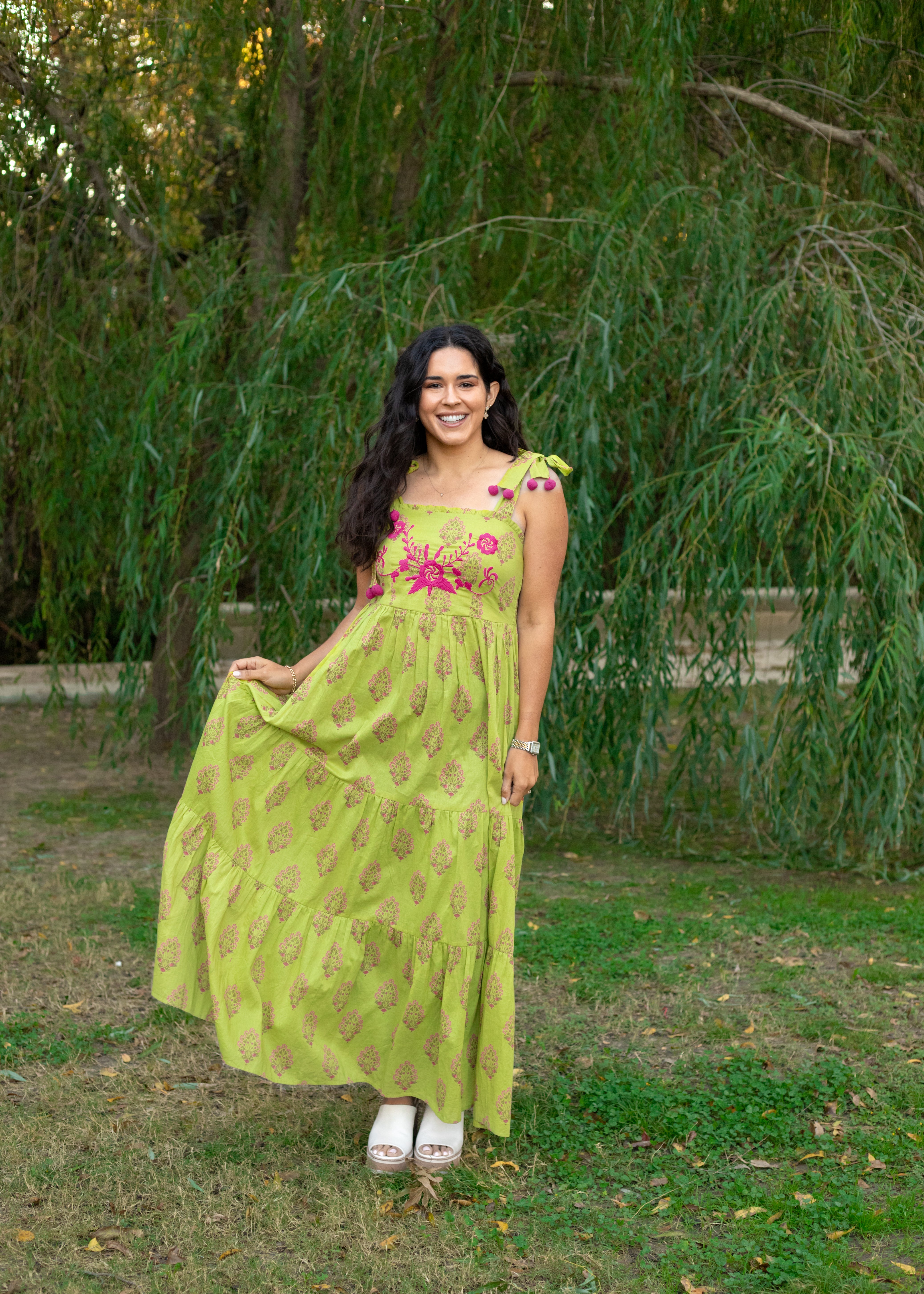 The Addison Maxi is the perfect addition to your spring and summer wardrobe. Pair with heels for church or barefoot at the beach! This dress is a chartreuse floral stamped maxi dress with pink embroidery and tie straps with pink pompom tassels.