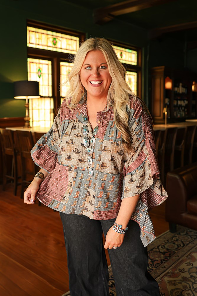 Love this top! Fit is TTS. Looks cute with jeans, leather pants, denim skirt. Fast shipping and great customer service. Love this brand!
