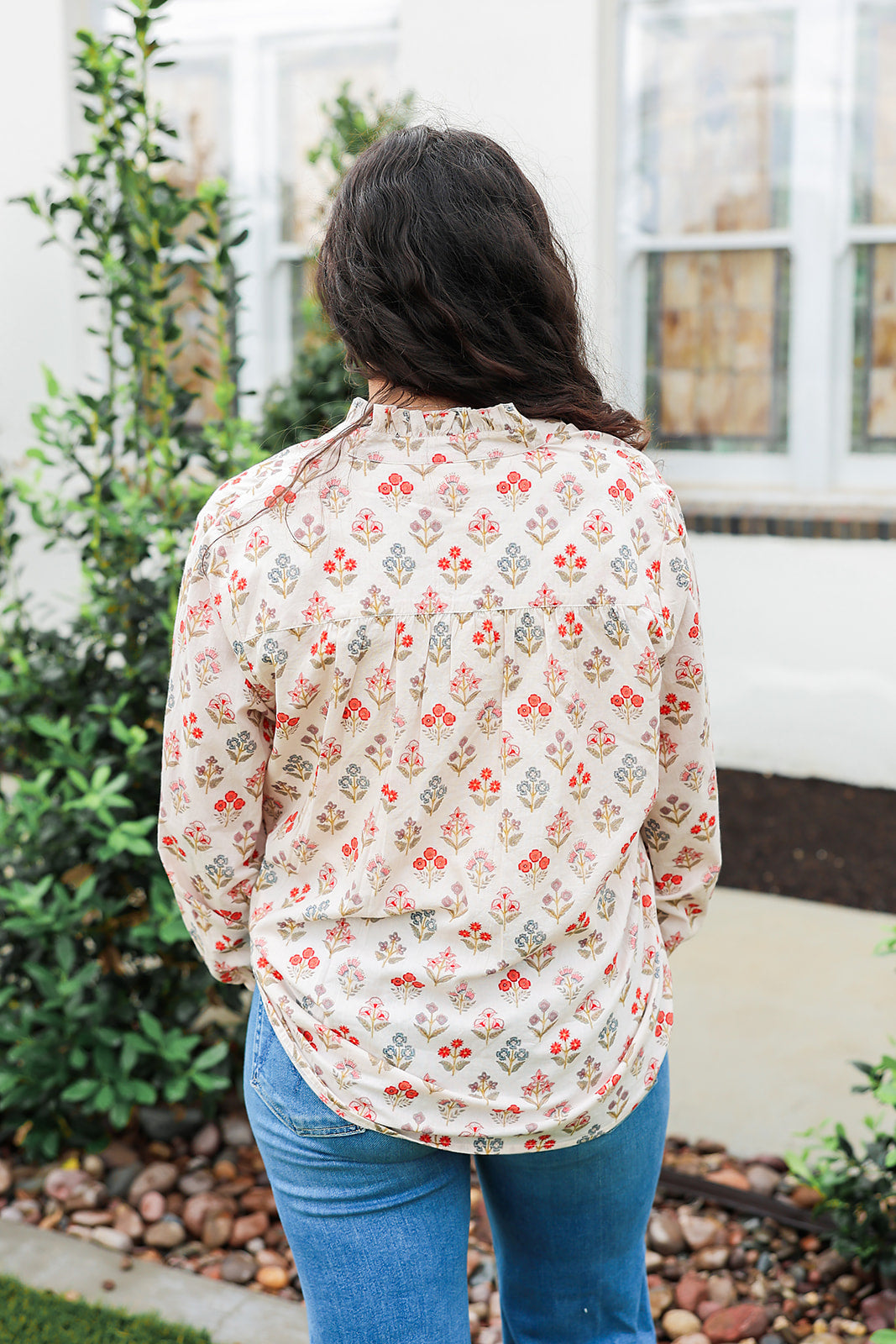 Woman with dark hair wearing a long-sleeve red and blue floral graphic shirt. Model paired this top with dark-wash denim jeans.