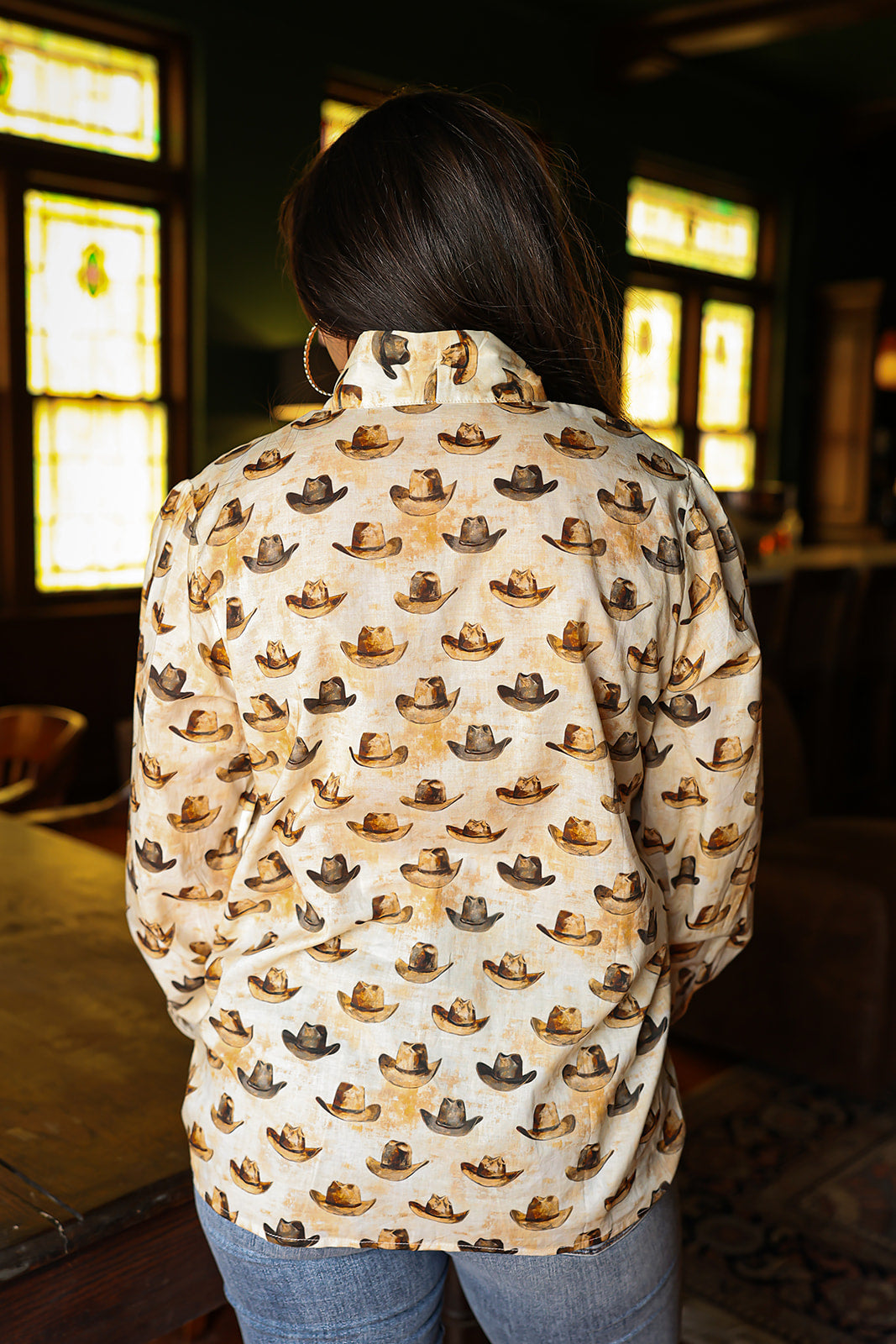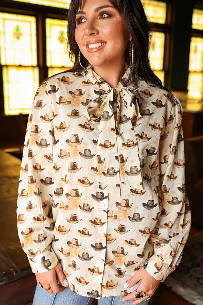 Woman with dark hair wearing a long-sleeve button-down with multi-colored cowboy hats and tying feature in front of top. Model paired this top with light-wash denim jeans.