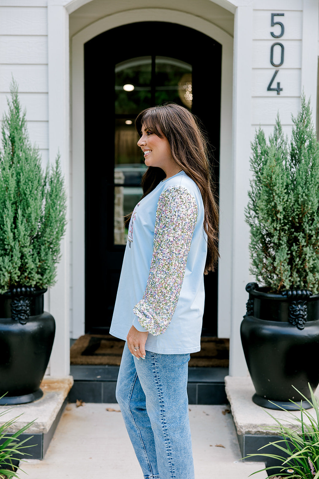 Woman with dark hair wearing a baby blue sweatshirt with iridescent sparkle sleeves; front of top has holiday truck embroidered on it. Model paired this top with light-wash denim jeans.